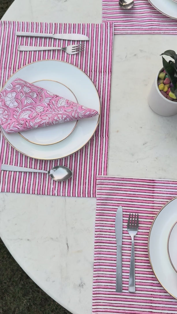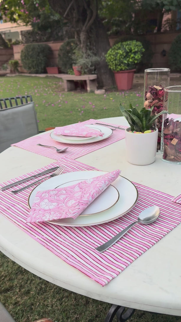 Elevate everyday dining with this thoughtfully coordinated table mat and napkin set, crafted in soft, breathable cotton. The striped placemats bring a clean, classic charm, while the floral block-printed napkins add a delicate, handcrafted touch. Perfect for casual meals or elegant gatherings, this set blends traditional artistry with a fresh, contemporary table setting.