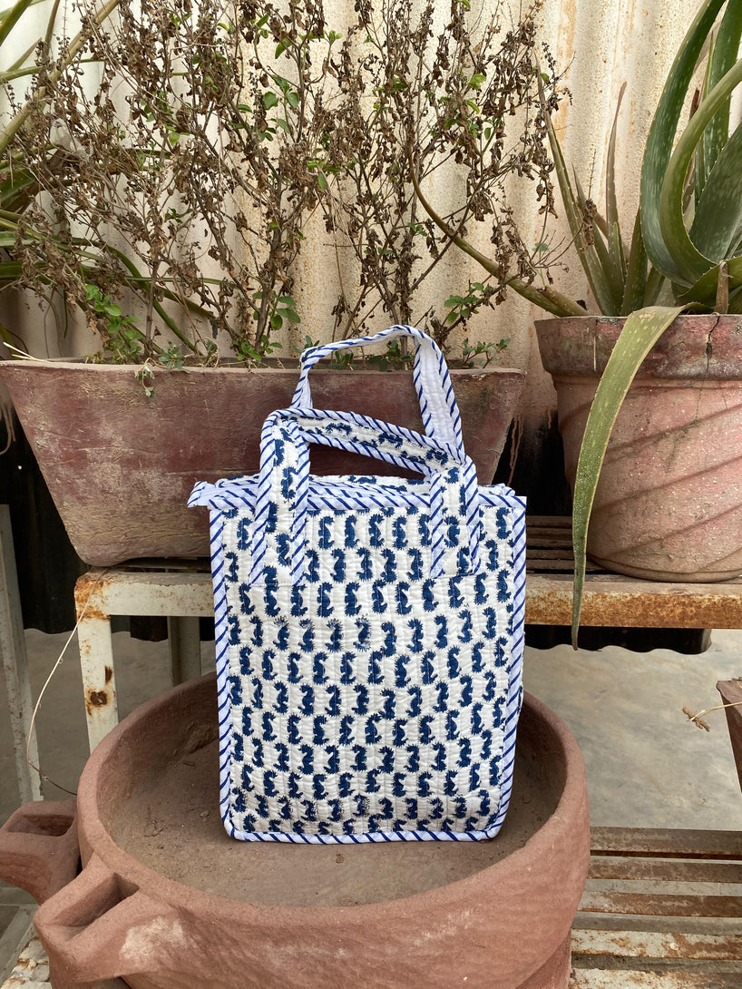 Crafted in quilted cotton and block printed by hand, this everyday bag is soft, lightweight, and made for slow living. Spacious enough for your day’s little rituals — be it a tiffin for work, a bottle upright in its own corner, or a book for quiet moments.